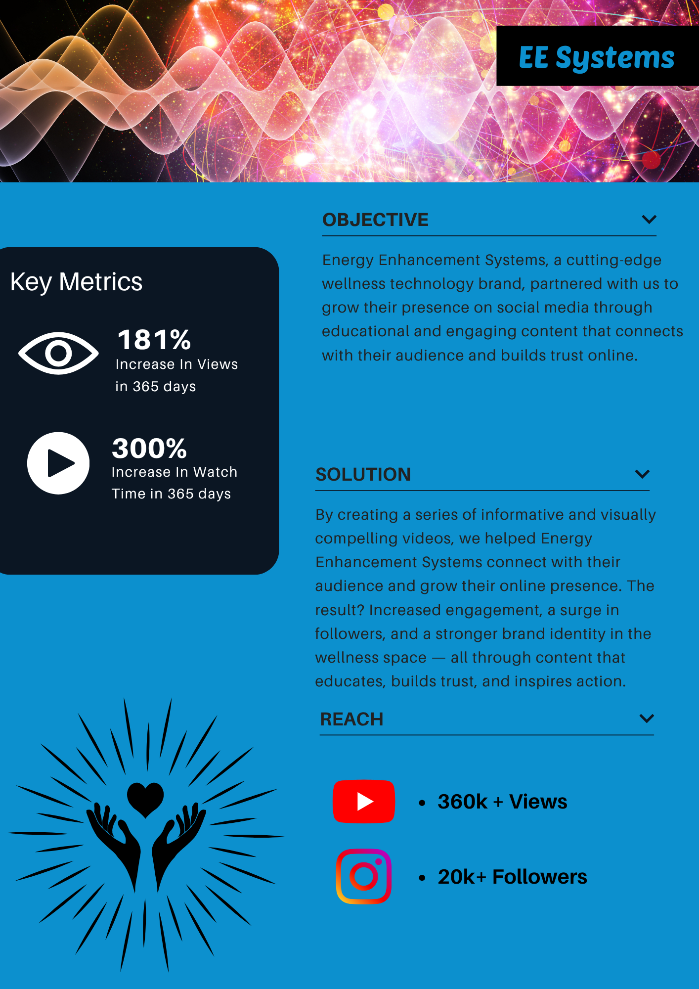 Infographic for EE Systems showing key metrics, objectives, solutions, and social media reach. Features a colorful abstract background with wave patterns and icons of an eye and play button.